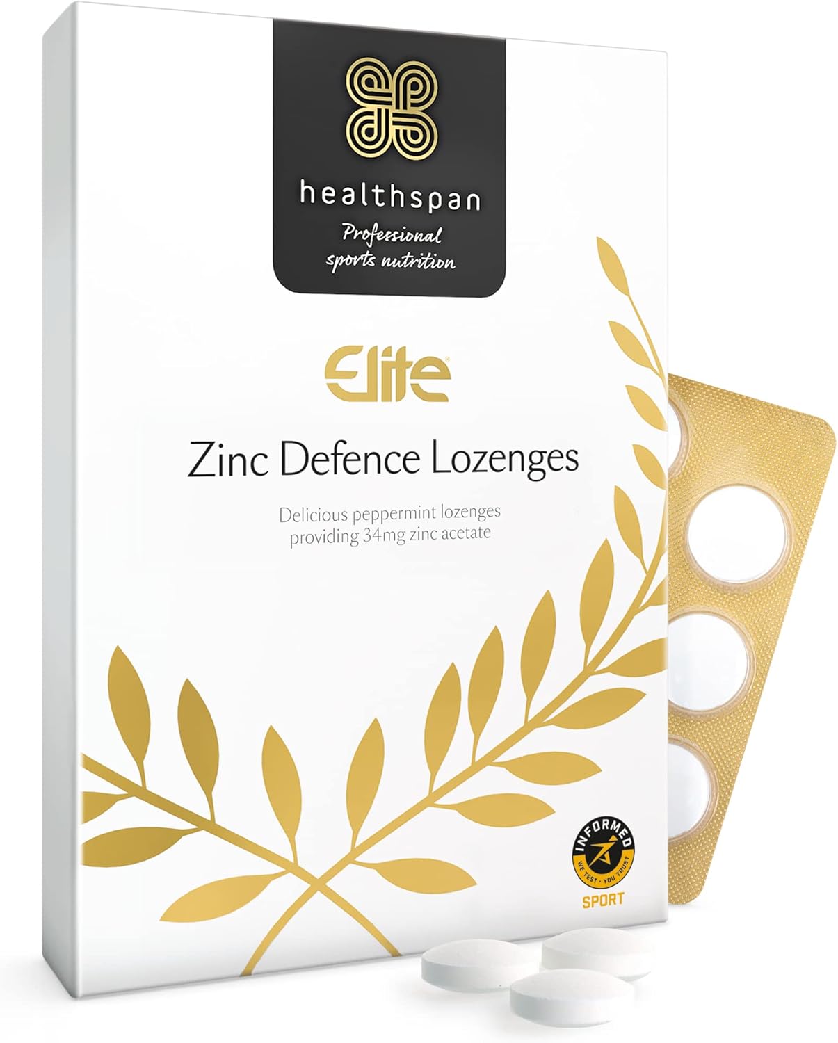 WHY CHOOSE HEALTHSPAN’S ZINC DEFENCE LOZENGES Each peppermint zinc lozenge provides 34mg of zinc acetate which delivers 10mg of active ionic zinc, which is the level most widely studied. Developed with leading sports nutritionists, Zinc Defence Lozenges are also batch tested and Informed-Sport accredited.